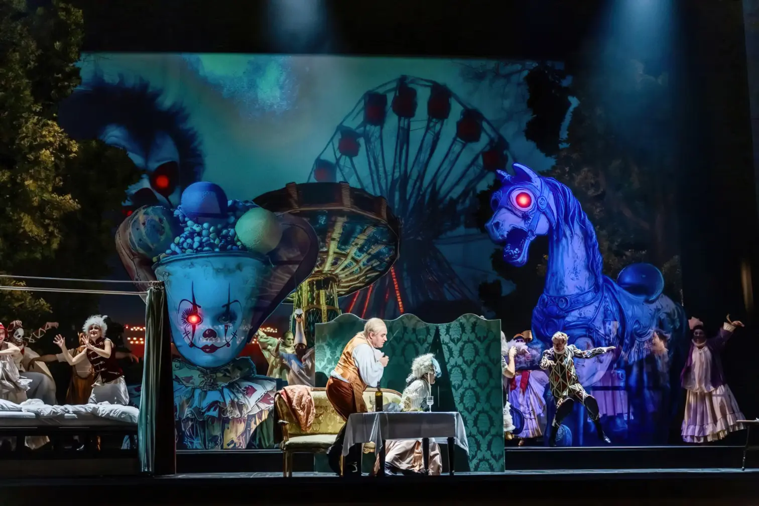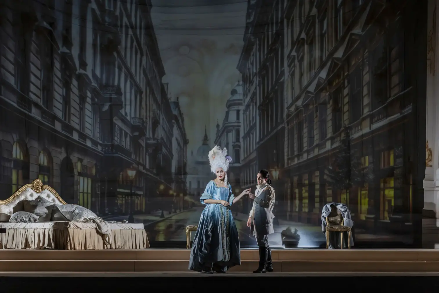 In the staging of Der Rosenkavalier, Stefan faced the task of translating emotional tone into visual space. The first act needed to feel light and airy, almost ephemeral. It became a solution where modern technology met the tactility of textile: an AI-enhanced photorealistic image in soft pastels printed on gobelin tulle. This transparent material allowed light to pass through gently, while maintaining the clarity and nuance of the printed design.