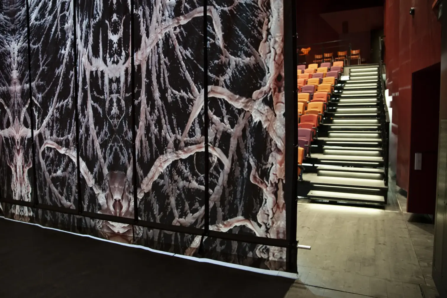 While the initial idea was a traditional side-hung curtain, the process led to a shift toward a lifting mechanism for greater flexibility. Big Image developed sketches, built prototypes, and tested various materials before deciding on cotton. A trusted material in theater, cotton offered a natural drape that enhanced the curtain’s movement while also allowing it to be printed in a single, seamless piece