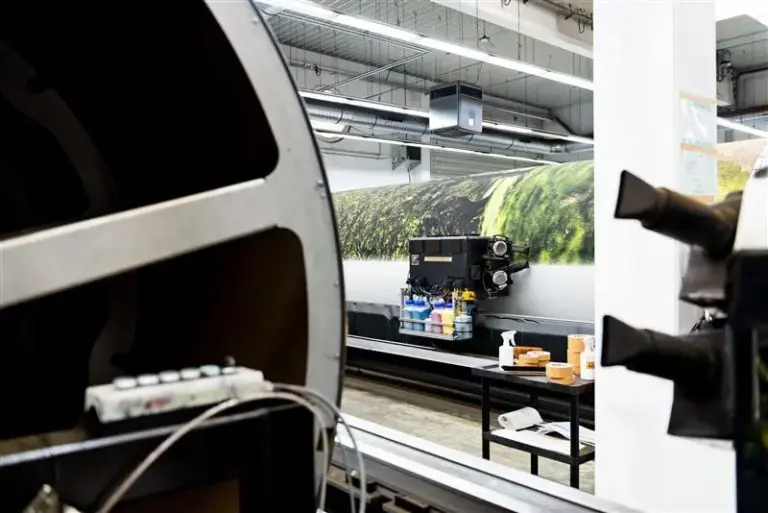 To achieve this, we developed our own proprietary printing technology. We call it Infinitus. Our Infinitus machines are custom-built textile printers developed by Big Image, launched in 2013 after three years of engineering. It is designed specifically for soft stage materials and can produce seamless prints up to 600 square meters , approximately 12 × 50 meters (40 × 150 feet). For larger dimensions, backdrops can be created with carefully crafted vertical seams to reach any size. The technology prints directly onto cotton fabric, either single-sided or double-sided. Combined with a self-developed alignment and registration system, it ensures consistent image precision and color accuracy across the entire surface.