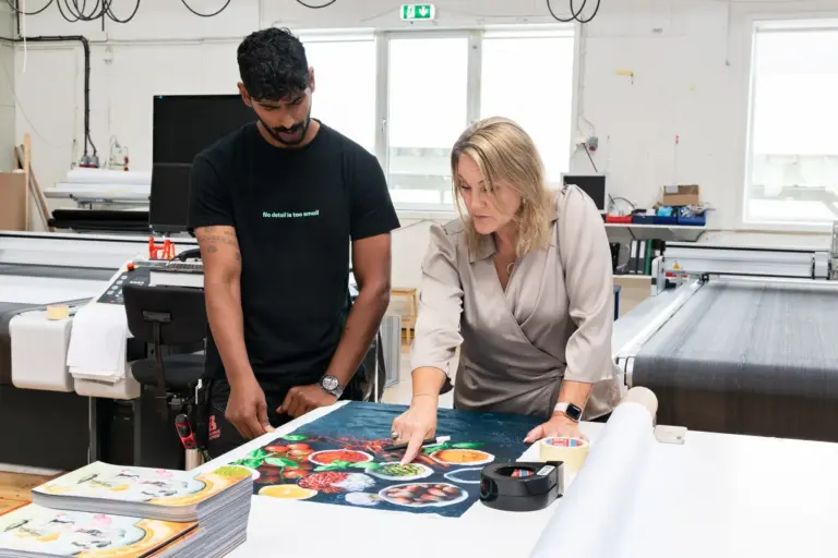 Ahead of production, test prints, color matching, prototype assembly and technical checks are carried out in the studio. are used to confirm the right result. This ensures the material and method are right before the final print run.