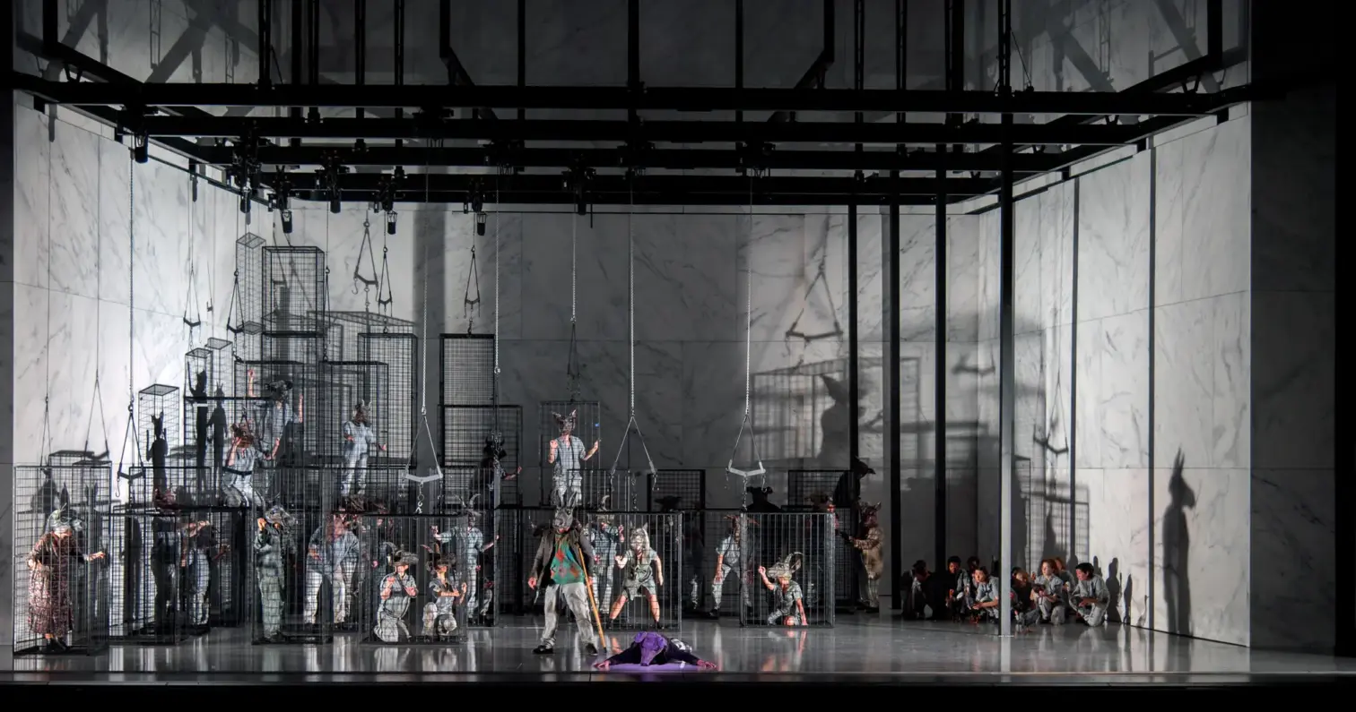 För att skapa mönstret till de storslagna marmorväggarna krävdes perfektion. Väggarna sträckte sig 14 meter upp i luften, och scenuppsättningen var designad för att kunna transporteras till flera olika platser, som Wien, Helsingfors och Palermo - var och en med olika scenmått. Inspirationen för scenografin, som kom från scenografen Paolo Fantin, var influerat från ett gammalt slakthus i Rom, som nu har gjorts om till ett museum som heter Mattatoio. Det konstnärliga teamet stod inför en utmaning: de behövde skapa en scenografi som fungerade för teaterbruk samtidigt som den gav känslan av ett äkta slakthus med tunga material såsom sten och stål. För att uppnå detta behövde materialet se ut som äkta marmor och inte vara målat.